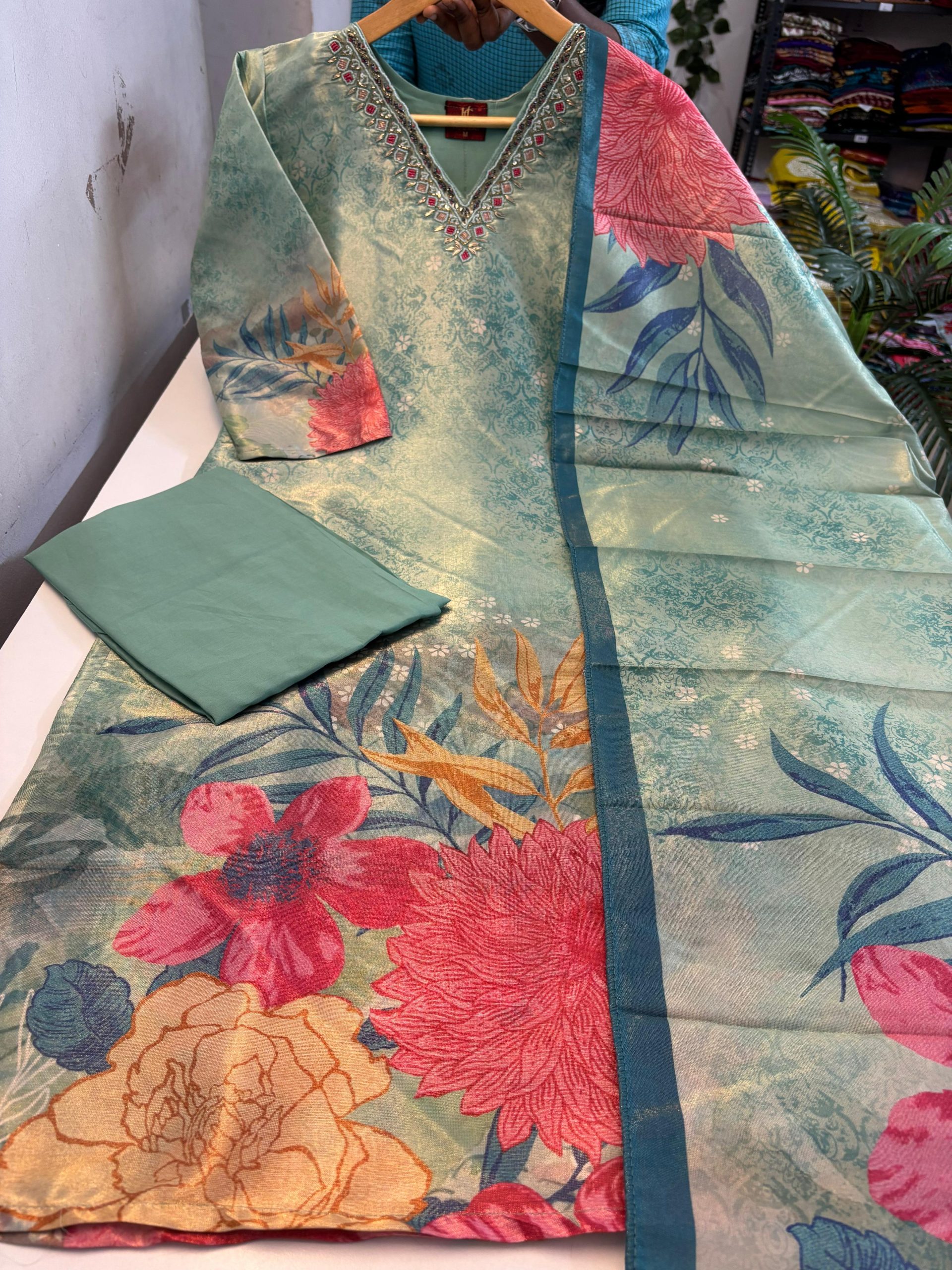 Premium Festive Wear Kurti With Pant & Dupatta Set With Lining Fabric: Shimmer Tissue Silk Kurti Length : 46 inches