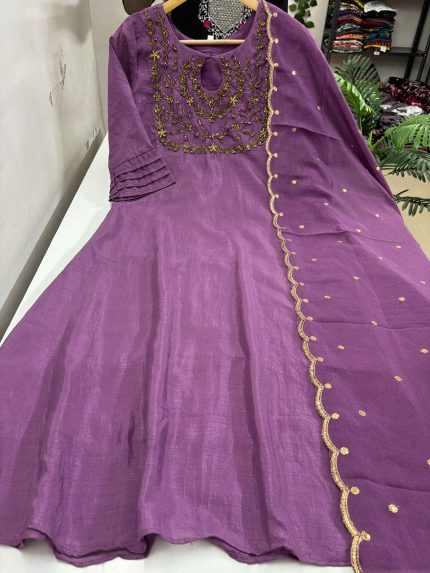 Premium Vichitra Silk A Line Kurti Dupatta Set With lining Heavy Hand Work On Yoke Portion Top Model – A