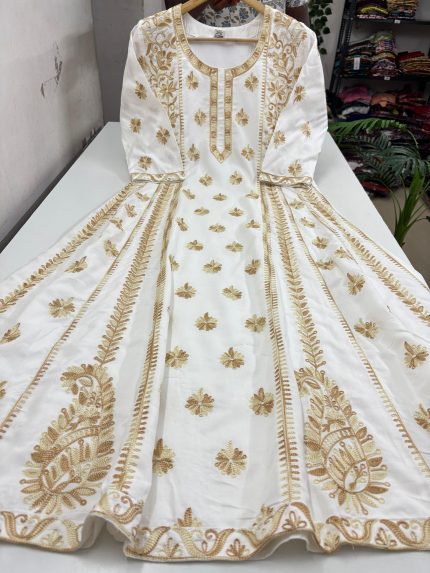 Hakoba A Line Frock With Puff Sleeves Beautiful Embroidery Thread Work On Yoke Portion Stitched With Cotton Lining Length: 44