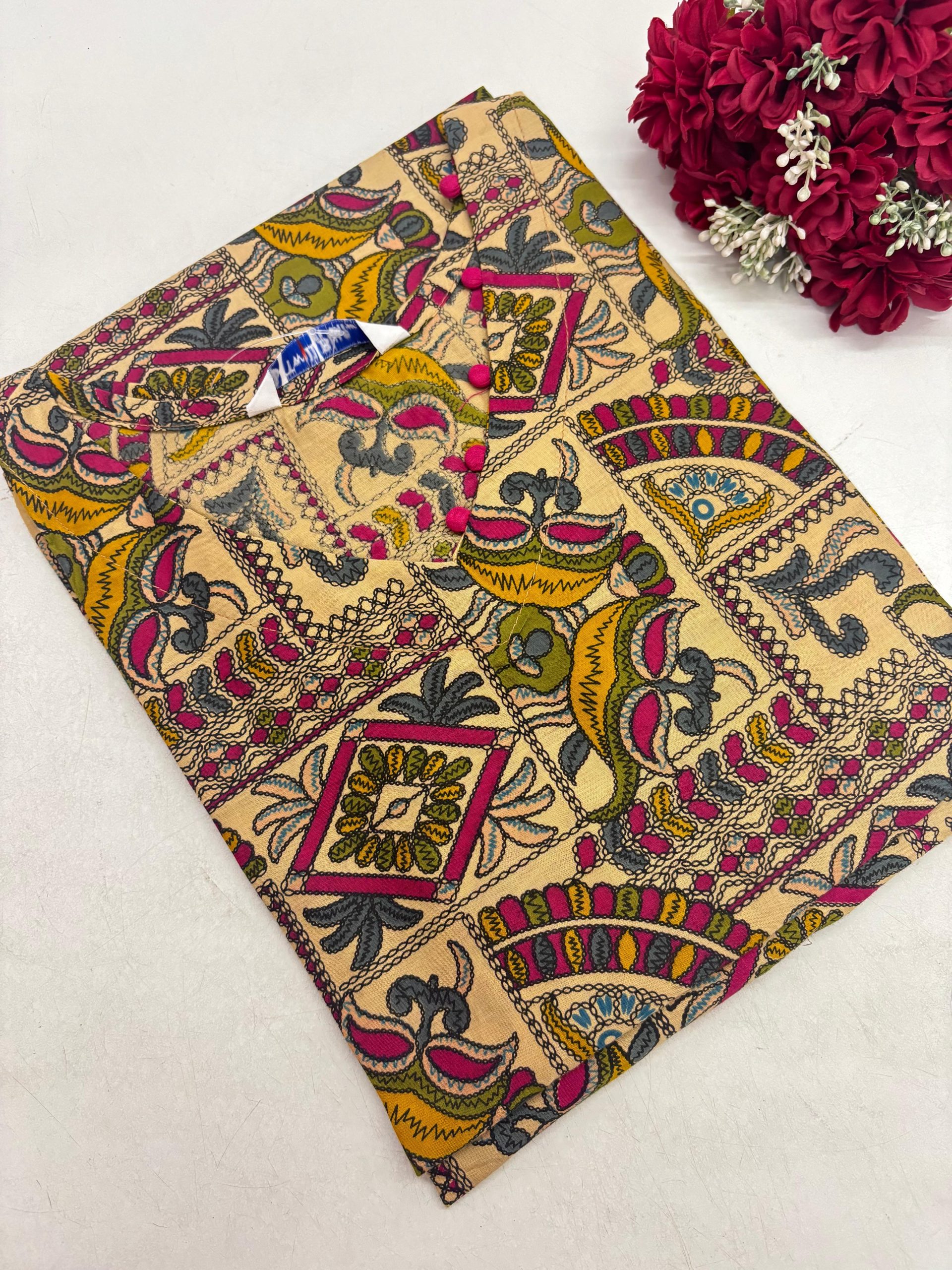 Kalamkari Cotton Side Open Kurti With Side Pocket