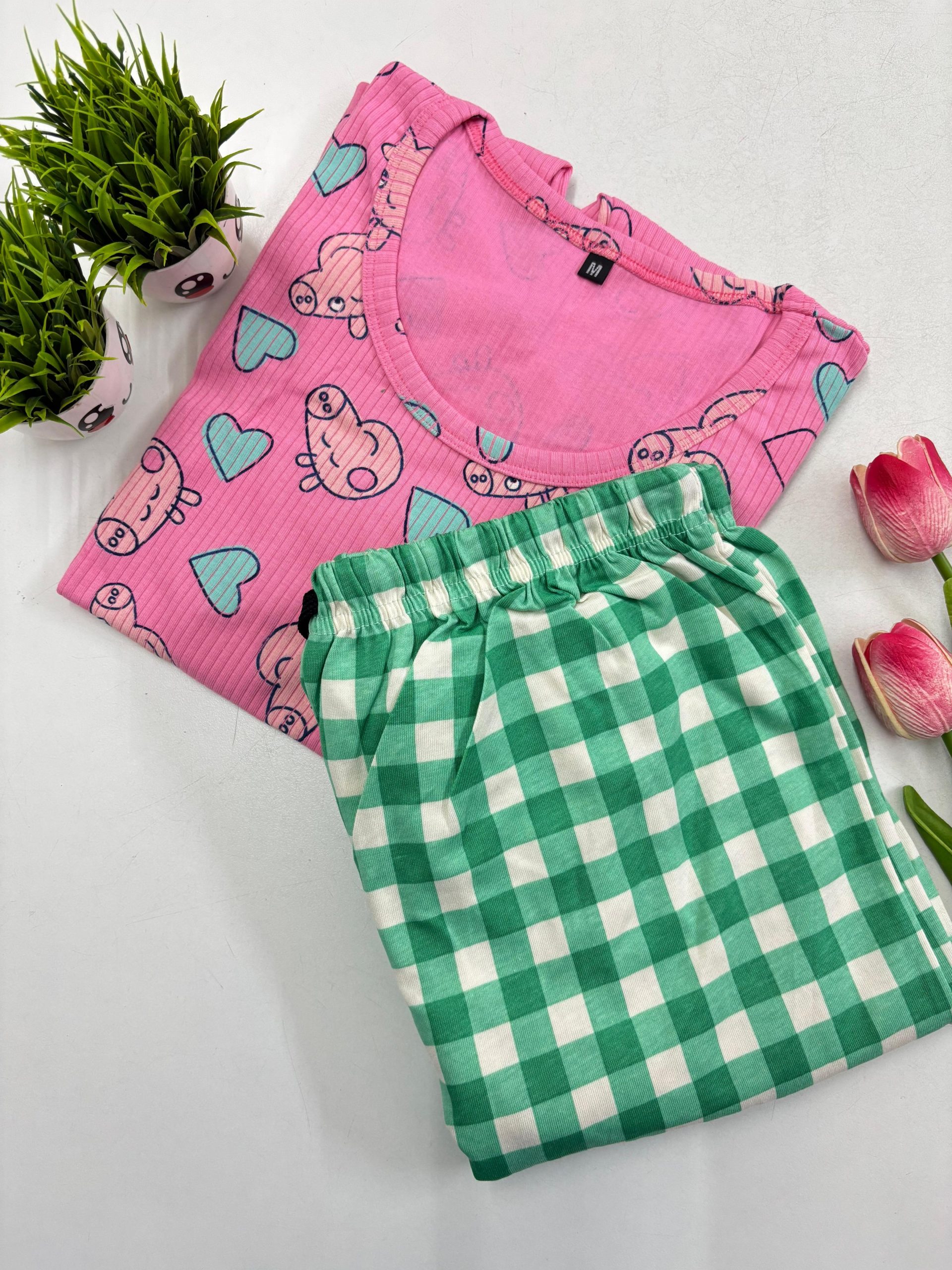Women’s knitted cotton T-shirt with night pant T-shirt length – 25-26.5inchs. Chest Size chart M-36 inches L- 38 inches Xl