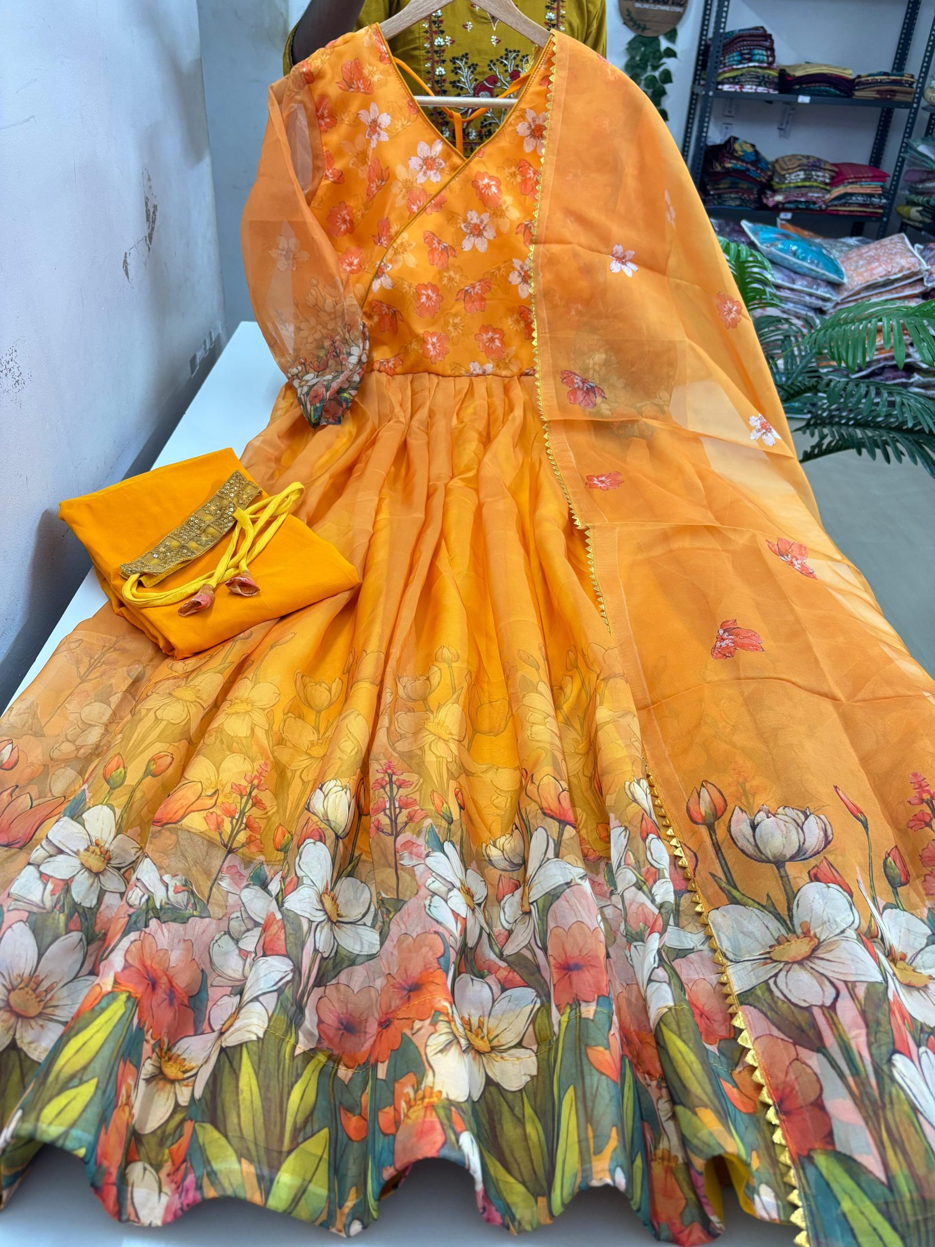 Organza Umbrella Top with pant and Dupatta Set Lining attached Fabric: Organza Length: 50 to 51 inches Size Chart :