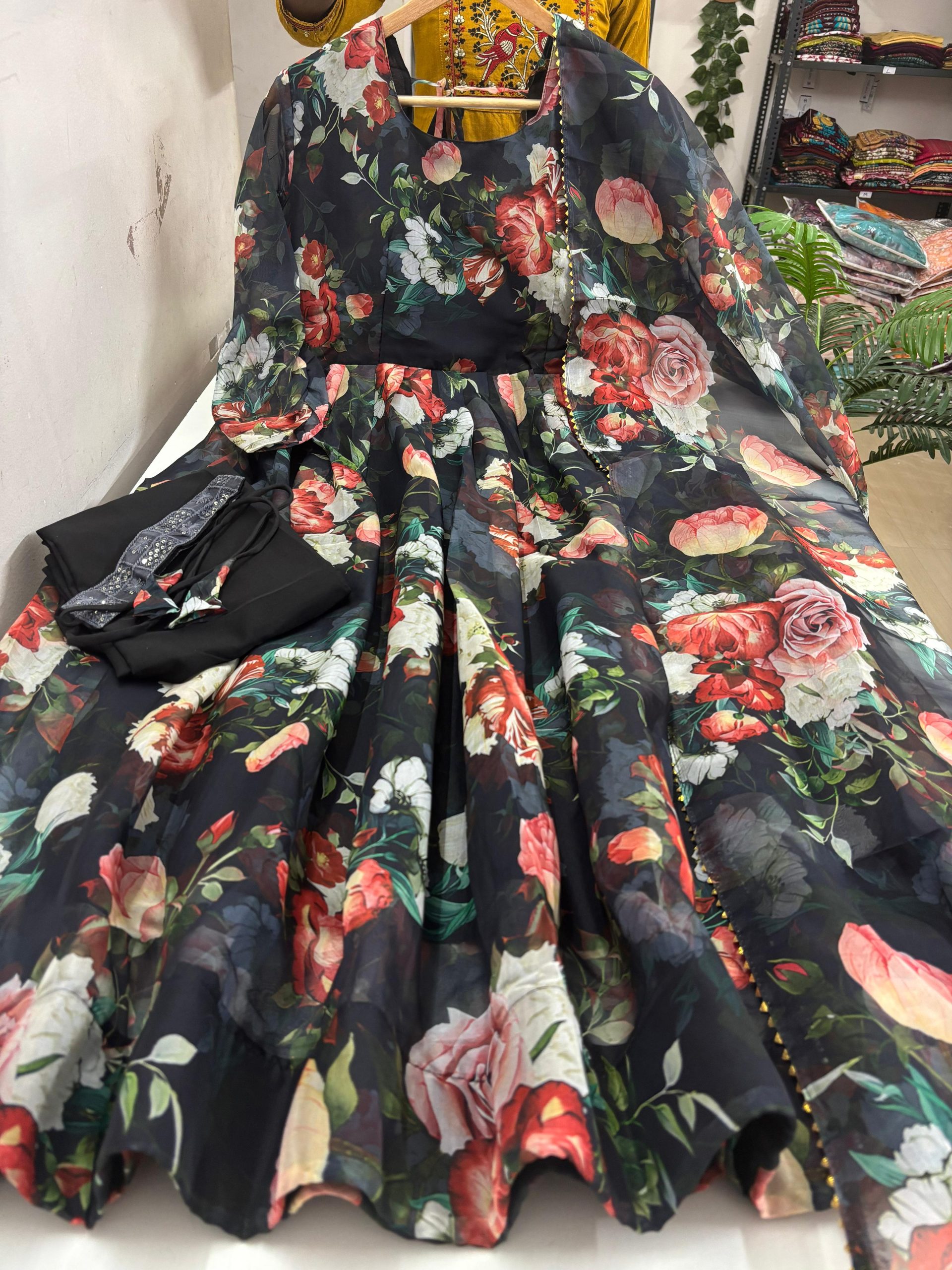 Organza Umbrella Top with pant and Dupatta Set Lining attached Fabric: Organza Length: 50 to 51 inches Size Chart :
