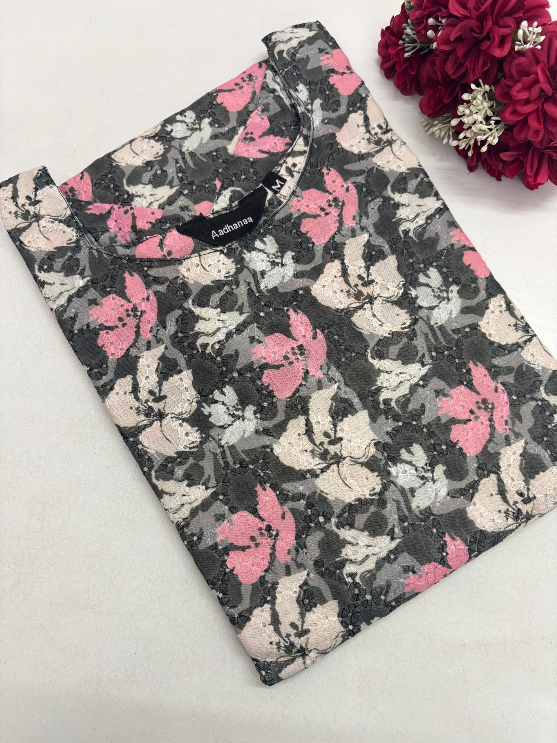 Handloom Cotton Embroidery Kurti – Grey & Blue Mixed