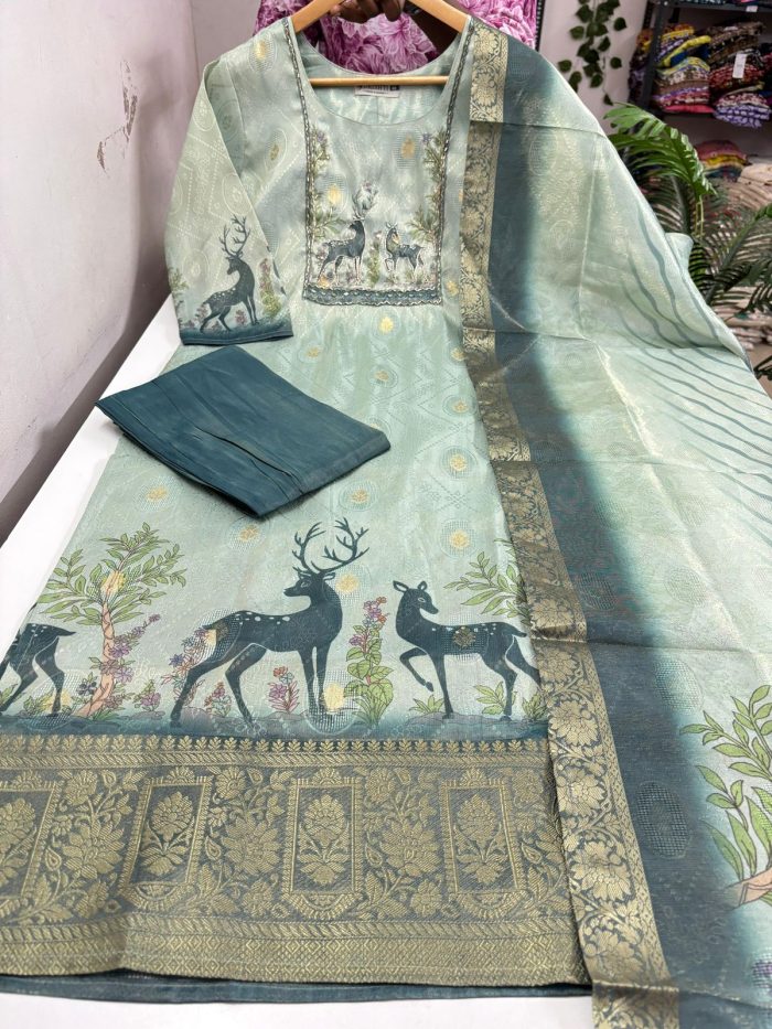 Premium Festive Wear Kurti With Pant & Dupatta Set With Lining Fabric: shimmer Tissue Silk Kurti Length : 44 inches