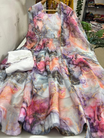 Organza Umbrella Top with pant and Dupatta Set Lining attached Fabric: Organza Length: 50 to 51 inches Size Chart :