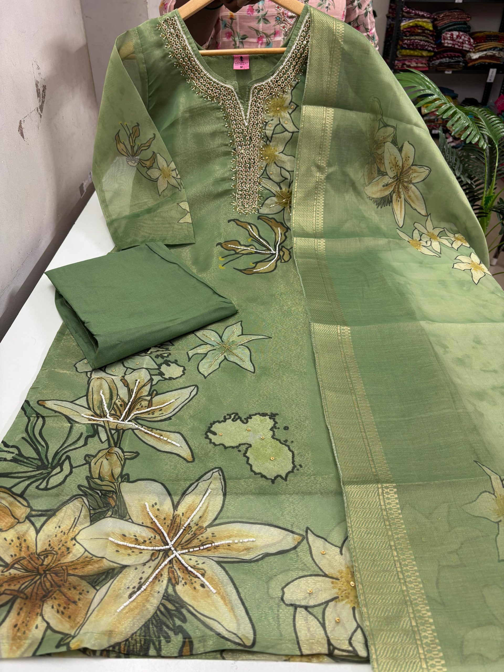 Premium Festive Wear Kurti With Pant & Dupatta Set With Lining Fabric: shimmer Tissue Silk Kurti Length : 44 inches