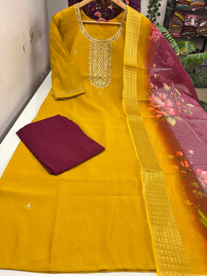 Premium Festive Wear Kurti With Pant & Dupatta Set With Lining Fabric: shimmer Tissue Silk Kurti Length : 44 inches