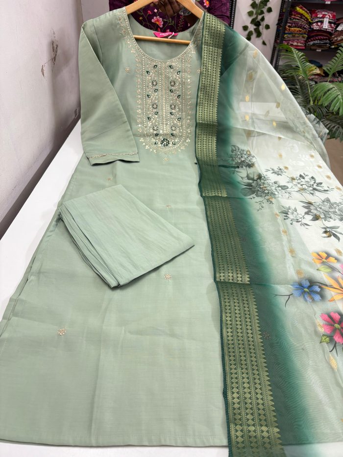 Premium Festive Wear Kurti With Pant & Dupatta Set With Lining Fabric: Tusser Silk Kurti Length : 46 inches Pant
