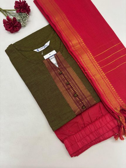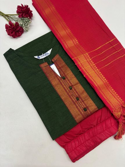 Handloom Cotton Kurti With Pant & Dupatta Set Fabric: Handloom Cotton Kurti Length : 40 to 41 inches Pant Length: